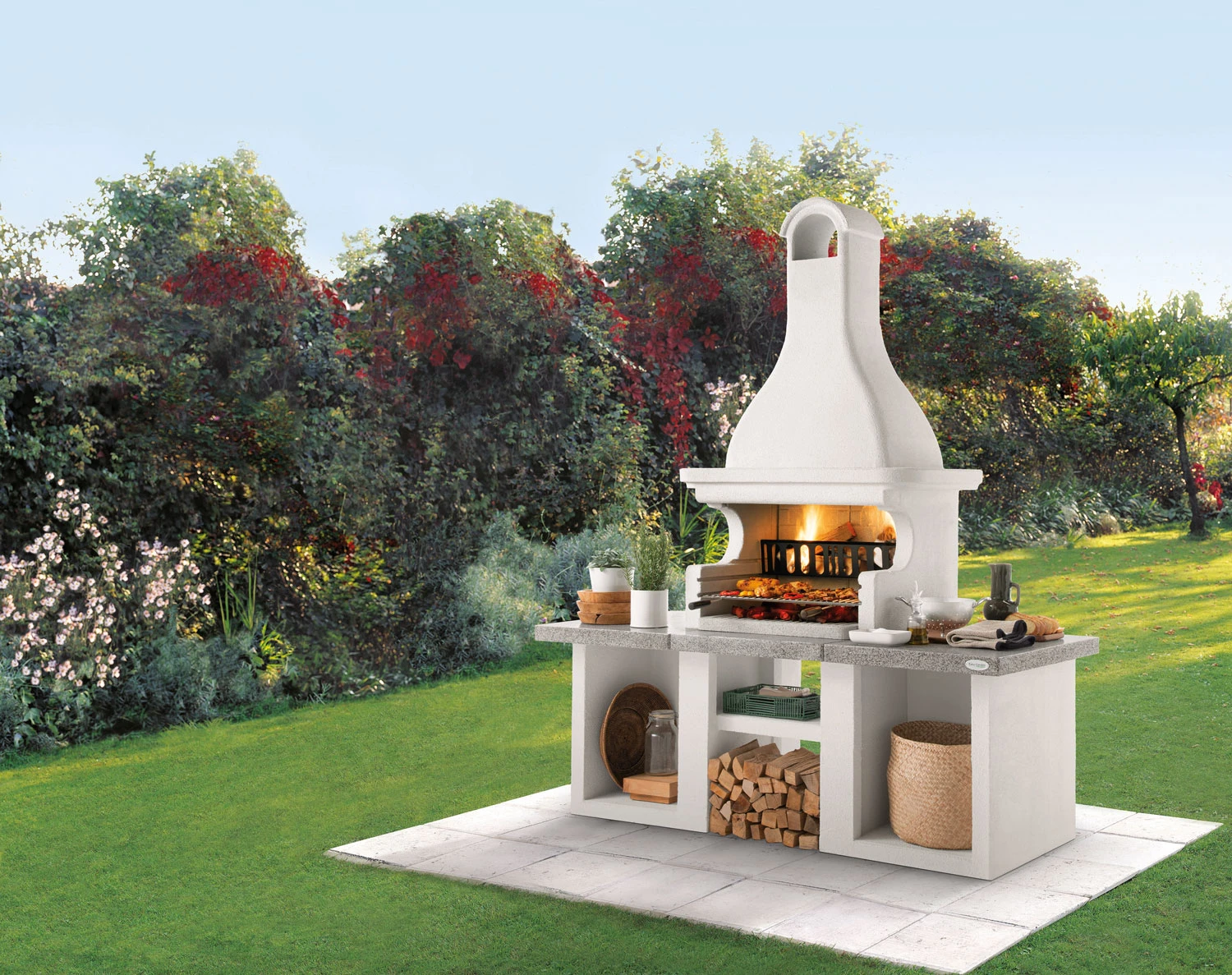 Der funktionelle Grillkamin besitzt 2 große Ablageflächen mit Stauraum und eine riesige Grillfläche. Die Ausstattung inkl. Feuerkorb und einer glänzend polierten Arbeitsplatte aus Marmotech sprechen für das besonders hochwertige und durchdachte Konzept der Fa. Palazzetti.